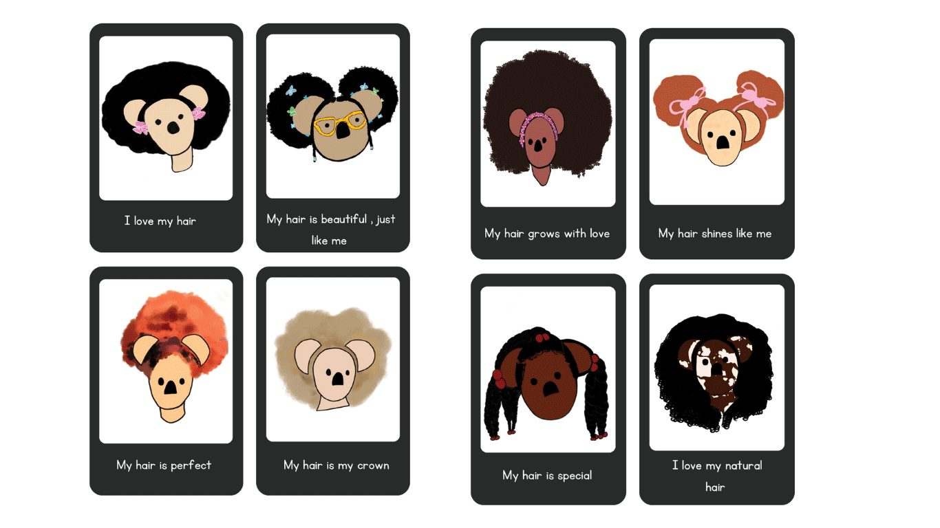 The Koloa characters is inspired by one of my favourite childhood shows, Blinky Bill and represents my connection to Australia. Creating the characters with coily and curly hairstyles connects back to my roots. Giving the characters traditional African hairstyles reflects my younger self’s wish to see more people who looked like me. These characters are a celebration of belonging. You can belong to two cultures without losing one, I had to. The characters help teach kids to celebrate their coils and culture.